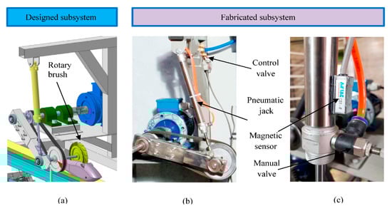 Pursuing the intersection line of vertical operation coefficient and air pressure of 4 bar, the required force value (37.86 N) falls between the possible standard bore sizes of 16 and 20 mm. Finally, a jack with 20 mm was selected. The method of selecting the jack is that by following the line obtained from the intersection of the axis related to the vertical operating coefficient of 0.5 and the air pressure of 4 bar, the upper limit bore size (20 mm) was selected. To avoid any contact of rotary brush with the moving grippers, the minimum vertical displacement length was 100 mm, so a pneumatic jack with the course of 150 mm was selected.