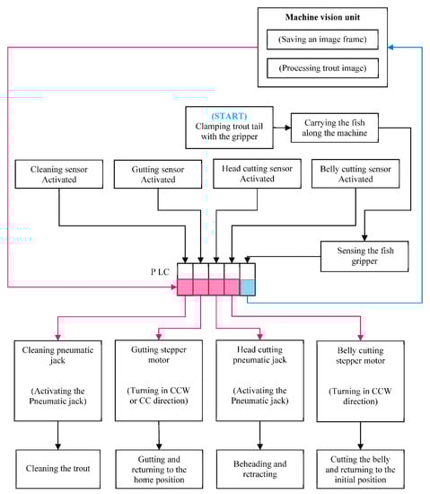 The function analysis is presented in Figure 10. As shown in this figure, at the initial step, the fish is gripped by a clamp. Then the fish is carried along the machine for further processing. By passing the fish in front of the camera sensor, the signal is sent to the controller. Then, the controller sends the received data to the interface (Matlab software) via TCP_IP protocol. A frame of the camera is captured immediately and saved for further process. In the next step, the extracted data return to the controller and are reserved specifically for each trout sample. As the gripped fish is carried along the machine, the sensors in each of the stations are stimulated and receive the related information from the labeled pack of the data. Regarding the length and feeding rate, the functioning arms cut or clean the trout with subsequent delays and speeds.