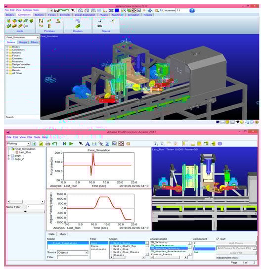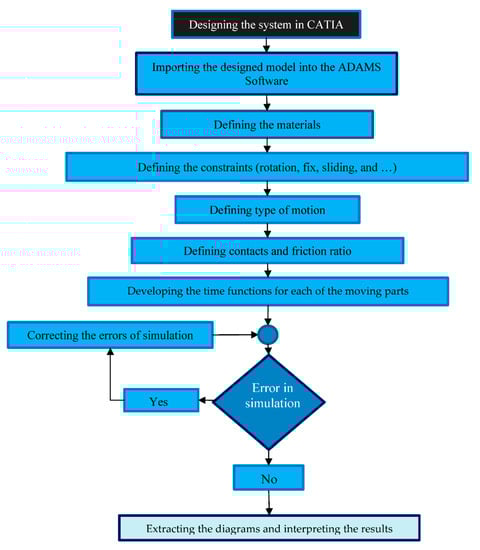 The simplest method is to design all the parts and define their weights to calculate the forces using the conventional method and numerical calculations. This method is applicable when the dynamic parameters are calculated for a single part or, in some cases, the limited number of parts within the relation. Using this method to determine accurate inertia reaction forces in a multi-body system faces a significant challenge unless the problem is simplified. It should be noted that in the simplification method, in addition to the time-consuming computational steps, the reaction forces and the dynamic and static friction conditions will not be the same as the real condition. Therefore, to have closer results to the real operating conditions and reduce the numerical calculations and increase output accuracy, the designed system in CATIA software was imported to ADAMS 2017 software and simulated for dynamic analyses. The simulation steps in the software are presented in Figure 11. The simulation process and extracting dynamic diagrams are presented in Figure 12.