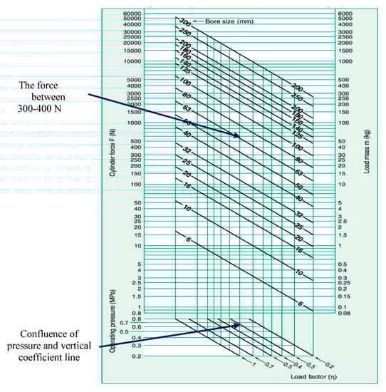 Based on the operational position of the jack (vertical or horizontal) and air pressure, the size of the air jack was determined based on the maximum force required to move the head-cutting subset (332.332 N). Since the supplied force in extraction mode is more than the retraction, the pneumatic jack was selected based on the amount of the force that the jack can supply in retraction mode so that it can supply the required force while the jack ascends toward the initial position. On the other hand, it should be considered that the operating speed of the jack is one of the most important characteristics for determining the size of the jack. By following the line obtained from the intersection of the axis related to the vertical operating coefficient of 0.5 and the axis of air pressure, the 0.4 MPa vertical line is determined.