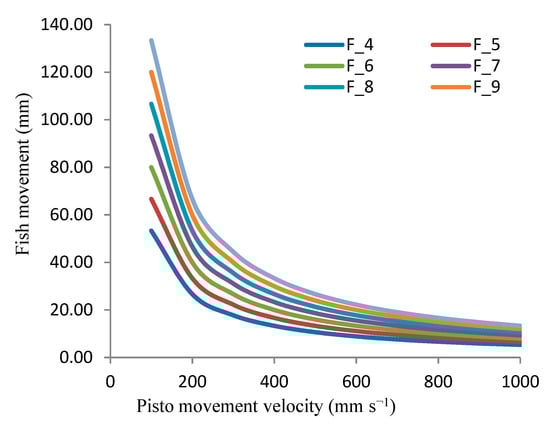 Figure 16 shows fish movement at different jack speeds. As shown in this figure, the displacement values at a particular capacity, such as the F-4, decrease non-linearly by increasing jack speed, so that at piston speeds in the range between 100–200 mm s−1, fish displacement decreases with a high slope while the slope decreases at speeds of 600–1000 mm s−1.