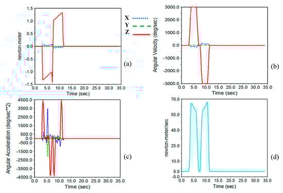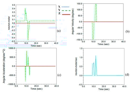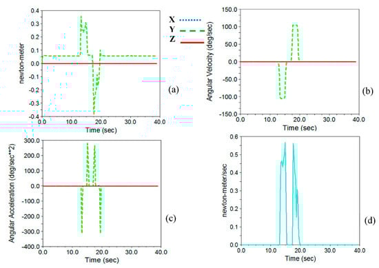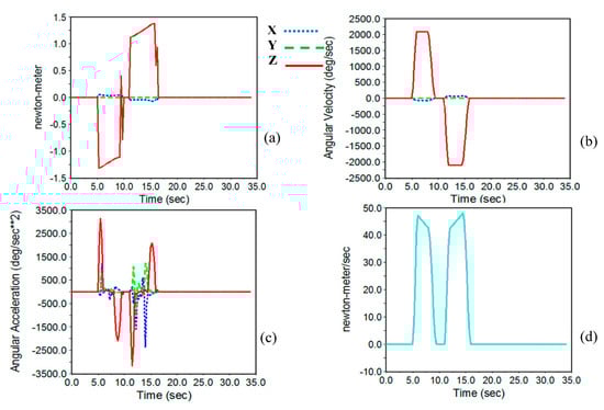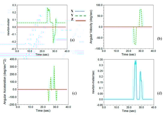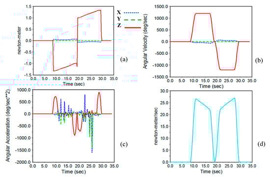 Results of ADAMS software simulation to determine the motor characteristics of the gutting subset (seven fish per minute). In this figure, (a–d) are torque, angular velocity, angular acceleration, and required power respectively.