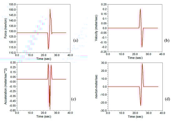 Results of ADAMS software simulation to determine the motor characteristics of the gutting subset (seven fish per minute). In this figure, (a–d) are force, velocity, acceleration, and required power respectively.