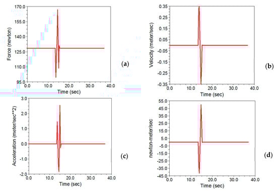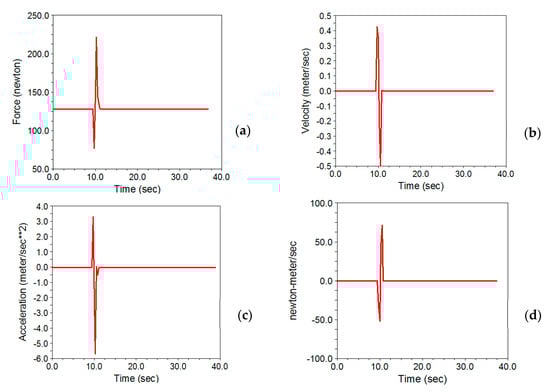 Results of ADAMS software to determine the characteristics of the jack of the head-cutting subset (four fish per minute). In this figure, (a–d) are force, velocity, acceleration, and required power respectively.