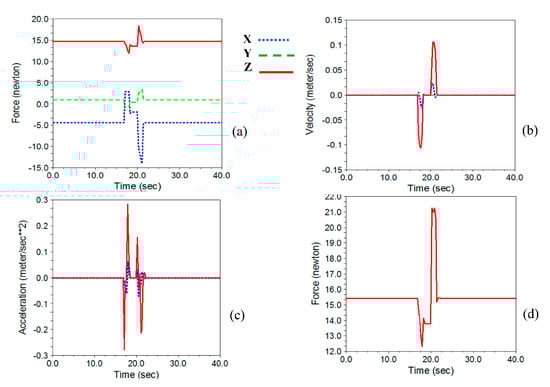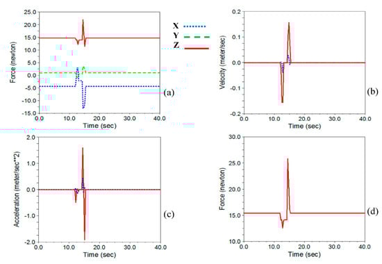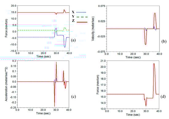 Results of ADAMS software simulation to determine the characteristics of the pneumatic jack of the cleaning subsystem (seven fish per minute). In this figure, (a–d) are force, velocity, acceleration, and resultant of the force in three direction respectively.