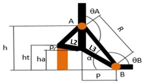 The initial geometrical study is circumscribed only to the stance phase because this is the phase in which the heel height influence is evidenced. Increasing it implies reducing monopodal support, caused by the tendency to accomplish greater stability during gait, which becomes more insecure as the heel height increases [3]. In Figure 1, points A and B represent the tibiotalar and metatarsophalangeal joints, respectively, where one is located at the ankle level and the other on the metatarsal heads. θA and θB represent these joints’ angles of rotation.