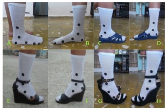 Figure 3. Location of markers on the lateral foot side (A) barefoot; (C) 2 cm heels; (E) 6 cm heels; (G) 10 cm heels) and on the medial foot side (B) barefoot; (D) 2 cm heels; (F) 6 cm heels; (H) 10 cm heels). - Step 4. Video recording and exporting to a PC: Video recording was done as 30 frames per second (fps) at a resolution of 640 × 480 p. The synchronization between both cameras was achieved by using a reference event: the moment the heel contacted the ground. Videos were exported to the PC via the camera’s USB connection.