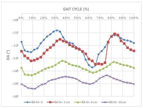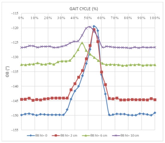 Figure 4 shows the variation of the angle at the tibiotalar joint () during the gait cycle for each heel height considered in this study.
