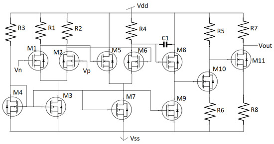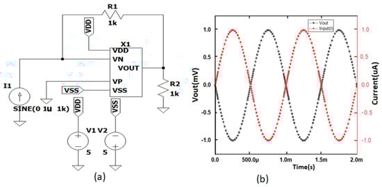 To convert the current from PMT into voltage, four transimpedance amplifiers are required as shown in Figure 2. The proposed OPA is configured as transimpedance amplifier as shown in Figure 6a. Resistor R1 is used as feedback resistor and the output voltage of the circuit is given by: