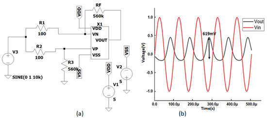 To compute the common mode rejection ratio (CMRR) of the OPA, a simulation setup shown in Figure 4a is designed and a sine wave of 2 V peak-to-peak is applied to the input terminal. Figure 4b shows the simulation result, the output peak-to-peak voltage obtained is 619 mV. CMRR is calculated by using the following equation:
