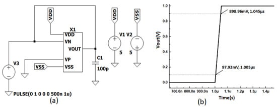 Slew rate is another important factor of the OPA which can be measured by applying a step signal at the input of OPA and the rate of change of the signal from 10% to 90% at the output of OPA is measured [41]. For computing the slew rate, the proposed OPA is configured in unity gain mode and an ideal pulse of 1 V amplitude is applied to input terminal as shown in Figure 5a. The corresponding simulation output is shown Figure 5b. Slew rate is computed by the following equation: