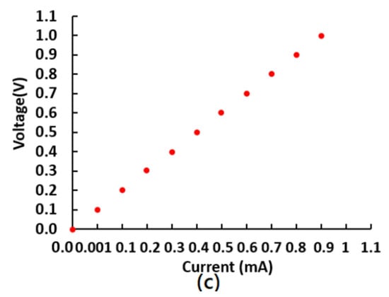 Figure 6b is the simulation result of the transimpedance amplifier, and it shows that, for the applied input current of 1 µA the corresponding output voltage is 1 mV, according to that given by Equation (9). The current from the PSPMT is in the range of tens of µA and Figure 6c shows the linearity of the TIA for the current range from 1 µA to 1 mA.