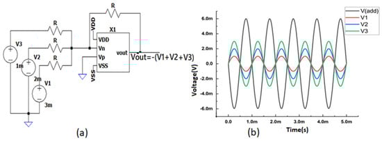 As given in Equations (2)–(4), an adder circuit is required for signal regrouping. The proposed OPA is configured as an adder circuit as shown in Figure 7a. Figure 7b shows the transient simulation result of the circuit. The output voltage of the circuit is the sum of the applied voltages V1, V2, and V3. The gain of the circuit is set to unity by choosing all the resistors of the same value. The amplitude of the applied input voltages is 1 mV, 2 mV, and 3 mV, respectively, and the output voltage is 6 mV as can be seen from Figure 7b.