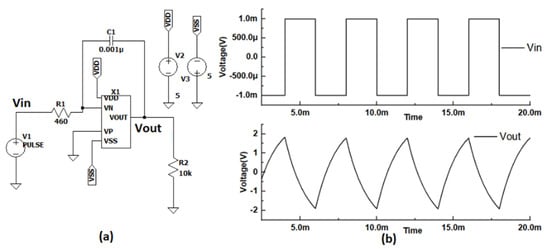 In the readout circuit, integrators are commonly used for pulse shaping or charge-to-time conversion. Our proposed OPA is configured as an integrator as shown in Figure 8a, and the corresponding simulation result is shown in Figure 8b. It can be seen from Figure 8b that the square wave input signal is converted into an approximated ramp signal at the output, verifying the operation of the integrator circuit. A perfect ramp signal cannot be obtained due to the exponential charging and discharging characteristic of capacitor C1.