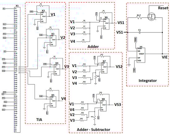 With the various modules designed using our proposed OPA and verified, the complete GaN-based readout circuit is built as shown in Figure 9. Block X1 is discretized position circuit; X2, X3, X4, X5 are the transimpedance amplifiers; X6 is the adder; X7, and X8 are the adder-subtractors. The outputs from the adder and adder-subtractor circuits VS1, VS2, and VS3 will be sent to the data processing unit as shown in Figure 1 for computing the position of the radiation event. The output VS1 is also fed to the input of integrator whose output VIE will be fed to the data processing unit for computing the energy of the radiation event.