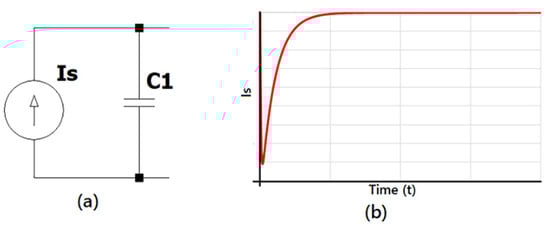 where is the charge of electron, G is the gain of PMT, PDE is photon detection efficiency of the scintillation crystal, is the number of the photons detected, and are the rise and decay time of the scintillator. The value of the parameters in Equation (13) for S11828-3344M SiPM and CsI(TI) crystal is given in Table 1 [43]. Figure 10 shows the equivalent circuit of PMT and the corresponding current pulse generated by Equation (13), and in our case, the current pulse is 40 μA.