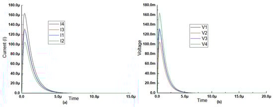 This pulse was applied randomly to different channels of DPC mimicking random radiation events, and the corresponding current signal (I1, I2, I3, I4) obtained from the four channels of the DPC is shown in Figure 11a. These current signals are then converted into voltage signals V1, V2, V3 and V4 by the TIAs shown in Figure 11b. The simulation result shows that the output signal obtained from the TIA has minimal shape distortion and follows Equation (1).