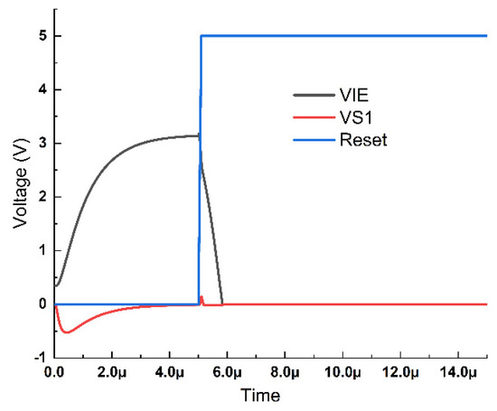 Figure 12 shows the outputs of adder X6, and integrator, respectively. Figure 12 shows that the reset signal remains low until the integration is performed, after that it toggles to the high stage and discharges the capacitor so that the integrator returns to initial state and the next signal will be integrated. The outputs VS1 is the sum of the input currents obtained from DPC as given in Equation (5). Suppose Q1, Q2, Q3 and Q4 are the integral of currents I1, I2, I3 and I4; , which is the sum of Q1 to Q4 representing the total charge collected by the PSPMT and proportional to the energy of the prompt gamma signal.