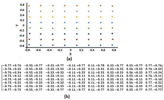 where A, B, C and D represents the peak values of the signals obtained from the four corner channels of the DPC. To verify if the circuit provides the correct position information, the current pulse given by Equation (13) was injected sequentially to each of the input positions of the DPC circuit mimicking the radiation event, and 64 such simulations were independently performed. The detected position information is computed using Equations (15) and (16), where the numerator of Equation (15) is VS2, the denominator of Equation (15) is VS1, the numerator of Equation (16) is VS3, and the denominator of Equation (16) is VS1. Figure 13a shows the detected positions of the PMT arranged in an 8 × 8 array and Figure 13b shows the corresponding position coordinates. The identification of the positions is accurately determined.