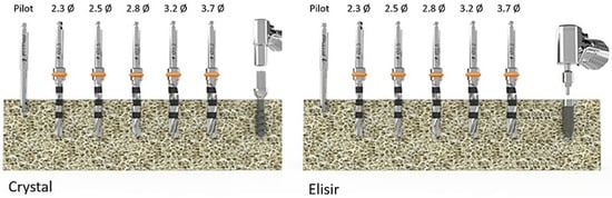 Drilling sequence protocol for the Elisir and Crystal Implant 3.8 mm Ø positioning. For both 4.8 mm Ø implants, one more drill with a 4.2 mm drill was performed.