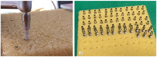 Experimental procedure of the investigation: (A) Polyurethane block drilling for implant positioning; (B) Dental implant positioned into the synthetic block.