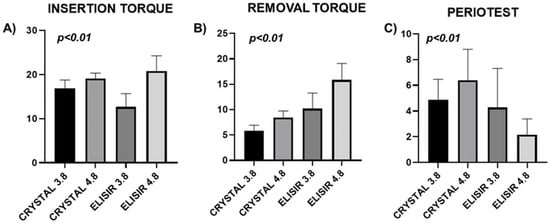 An IT and RT significant difference was reported between the study groups as being in favour of the wide diameter implant design (Group B–D), compared to the narrow diameter implant (Groups A–C) (Figure 4A,B) (Table 2 and Table 4) (p < 0.01).