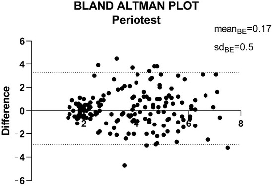 The intra-examiner agreement of the Periotest assessment was presented in Figure 5, showing a mean bias of 0.17 ± 0.5 (95% CI: −2.914 to 3.258).