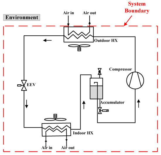 The exergy of a system is the maximum valuable work possible during a process, bringing the system into equilibrium with a heat reservoir. The system boundary, as shown in the Figure 3 was used in the calculation of exergy efficiency. In conformity with the work by Gullo et al. [22,23], the conventional exergy analysis was performed by applying Equation (6) to each component of the investigated system. Equation (6) represents the exergy rate balance within the selected control volume (i.e., the selected component) at steady state conditions, allowing for the assessment of the source of its thermodynamic inefficiencies by calculating its exergy destruction rate (). Equation (6) is presented as follows: