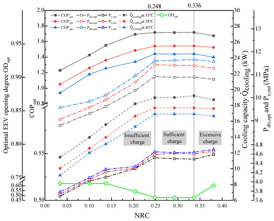 The effect of normalized refrigerant charge (NRC) on COPopt, cooling capacity (), optimal discharge pressure (Pdis,opt), outlet pressure of evaporator (Pe,out) and optimal EEV opening degree (ODopt) at ambient temperatures of 35 °C, 38 °C and 40 °C.