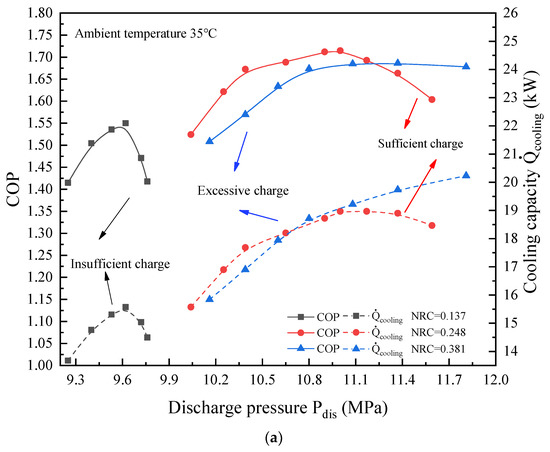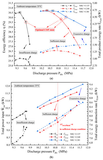 Figure 7 shows the effect of the discharge pressure (Pdis) on the exergy efficiency (η), the total product exergy rate (), the total power input () and the total exergy destruction rate () at 35 °C. It can be seen from Figure 7a that the value of η first increased and then decreased with rise in Pdis under different charging conditions. Total power input went up almost linearly with the increase in Pdis, whereas the growth rate of continues to rise (shown in Figure 7b), resulting in a peak value of η. However, the Pdis corresponding to the maximum η of each charging condition was smaller than that of the maximum COP. The maximum value of η increased first and then decreased with the NRC increase and achieved the maximum value of 30.74% in the sufficient charging condition. In addition, similar to cooling capacity, the total product exergy rate () first increased and then decreased with the rise in Pdis in the insufficient and sufficient charge conditions, whereas no peak value in the excessive charge condition was observed.