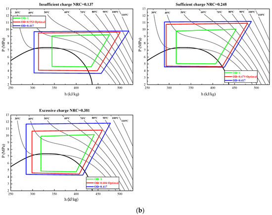 Figure 5a shows the variation of COP and with discharge pressure when the NRC is 0.137 (insufficient charge condition), 0.248 (sufficient charge condition) and 0.381 (excessive charge condition) at 35 °C. It was found that as Pdis reached the optimal value, both COP and reached the maximum values. Furthermore, when the discharge pressure was higher than Pdis,opt, both COP and decreased significantly in the insufficient charge condition, whereas they declined more slightly in the sufficient charge condition. However, in the excessive charge condition, as the COP started decreasing slightly, was still increasing significantly. These phenomena were caused by the migration characteristics of the refrigerant. Figure 5b depicts the P-h diagrams of the investigated system at the aforementioned three conditions at different EEV opening degrees. As the value of OD decreased from 1 to 0.417, Pdis increased slightly (from 9.25 MPa to 9.78 MPa) and Psuc reduced from 4.58 MPa to 3.63 MPa under the insufficient charge condition. The variation of Psuc was more marked than Pdis with the rise in OD, leading to a significant increase in the superheating degree of the system and thus to a sharp reduction of the CO2 mass flow rate. Although the enthalpy difference in indoor HXs increased, the cooling capacity was found to reduce. With the rise in refrigerant charge, the amount of refrigerant in the indoor HXs and outdoor HX increased. Additionally, the Psuc decreased slightly and the Pdis increased with the reduction in OD. Under the sufficient charge condition, Pdis increased from 10.04 MPa to 11.17 MPa and the Psuc reduced from 5.02 MPa to 4.53 MPa as the value of OD decreased from 1 to 0.417. In addition, as OD was lower than the optimal value, the refrigerant drawn by the compressor was superheated vapor and its superheating degree increased with decrease in EEV opening degree, resulting in a slight reduction in cooling capacity. Under the excessive charge condition, Pdis sharply increased from 10.16 MPa to 11.81 MPa and the refrigerant drawn by the compressor was in the condition of a vapor–liquid mixture. Thus, the increase of enthalpy difference in the evaporators rather than the decrease of flow rate was the main factor affecting the system cooling capacity, causing an increase in cooling capacity. Therefore, it could be concluded that from the insufficient charge condition to the sufficient charge condition, the refrigerant mainly migrated to the three heat exchangers, whereas in the excessive charge condition the accumulation of refrigerant in the gas cooler was more marked than that in the evaporators.
