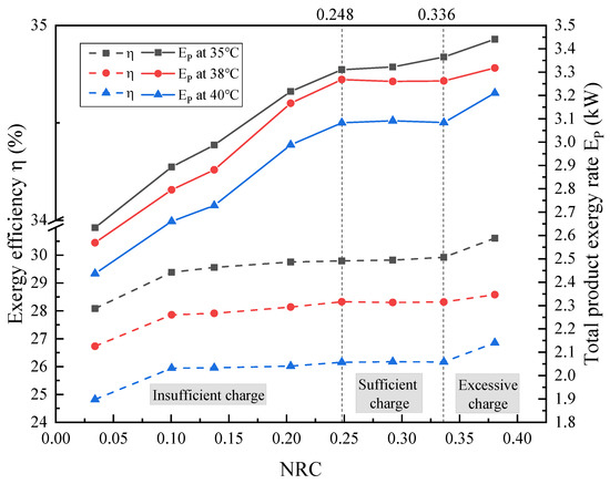 The effect of normalized refrigerant charge (NRC) on exergy efficiency (η) and total product exergy rate () corresponding to the optimal COP at ambient temperatures of 35 °C, 38 °C and 40 °C.