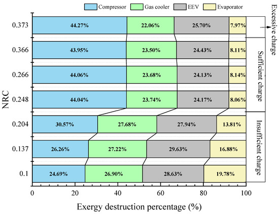 The variation of exergy destruction percentages of the compressor, gas cooler, EEV and evaporator with NRC corresponding to the optimal COP at ambient temperature of 35 °C is shown in Figure 8. It was found that the exergy destruction percentage of the compressor varies more significantly, increasing from 24.69% to 44.27% as NRC increase from 0.100 to 0.373. This is related to the slight increase of the compressor isentropic efficiency. On the contrary, the exergy destruction percentage of the evaporator decreased from 19.78% to 7.97% mainly due to the rise of the evaporation pressure and the reduction of the heat transfer temperature difference between air and refrigerant. In the gas cooler the exergy destruction decreased gradually due to the reduction of the compressor discharge temperature. Furthermore, the CO2 entropy difference between the inlet and outlet of the EEV decreased gradually with rise in NRC, thus the exergy destruction percentage also showed a slight downward trend. The exergy destruction percentage of the gas cooler and EEV corresponded to 22.06~27.08% and 24.13~29.63%, respectively. It could be concluded that insufficient refrigerant charging in the investigated air conditioner unit seriously affected the thermodynamic performance of the indoor and outdoor HXs, whereas slight overcharge was found to have little effect on the thermodynamic performance of each component. Finally, the obtained results suggested the need to improve the efficiency of the CO2 compressor.