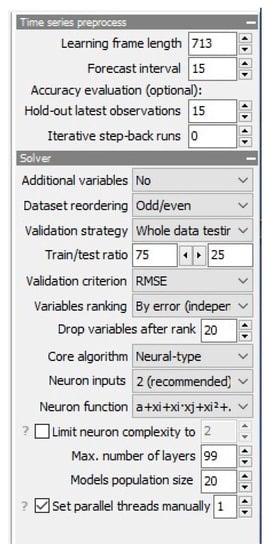 The advantages of the GMDH-type NN presented above have determined its application in the prediction of deviations for UTC(PL). Predicting the deviations for the Polish Timescale UTC(PL) by means of GMDH-type NN has been carried out on the basis of the method of time series analysis by means of the commercial GMDH Shell tool. Figure 1 presents the GMDH Shell application solver view, in which the values of the NN training parameters are selected. A detailed description of the selection of these parameters is presented in [21]. The duration of the entire process of data preparation, training the GMDH-type NN, and receiving the prediction result is approximately 50 min.