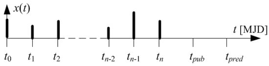 Predicting the values of [UTC-UTC(k)] deviations by means of NNs for the selected UTC(k) scale is based on a time series x(t), the values of which (Figure 2) are determined at times t0 to tn, where t0 is the day of the first known value of the time series, and tn is the day of the last known value of the time series in the month preceding the prediction. The values of the time series elements for the last month preceding the prediction designation may be determined not earlier than on day tpub. This is the date when BIPM publishes the [UTC-UTC(k)] deviation values for previous month. They are designated for MJD days that end with digits 4 and 9, i.e., with a 5-day interval (tn − tn−1 = 5).