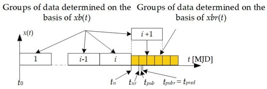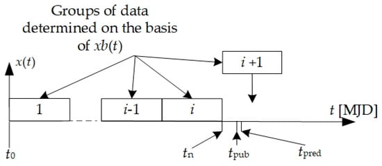 The time tpred is the day when the deviation for UTC(k) is predicted by the GMDH-type NN. Striving to achieve the highest possible accuracy of UTC(k) prediction also forces the prediction process to keep the prediction horizon as low as possible, i.e., the time interval tpred − tn, which depends on the publication date (tpub) of the xb(t) deviation values. Taking into account the time tpub and the need to make a prediction of xbpred(tpred) deviation for the next MJD day that ends with digits 4 or 9, the prediction of deviation is carried out between the 10th and 20th day of the following month. Establishing predictions for the following days (4 and 9) and in the following months for the same training data will cause, regardless of the analytical and NN methods used for prediction, a significant increase in prediction errors. Practically, it means that one value of the predicted xbpred(tpred) deviation is determined in a given month. However, to determine the prediction in the next month, it is necessary to supplement the x(t) time series with a new group of data i + 1 (Figure 3), taking into account the new values of xb(t) deviations from the month preceding the prediction, published by BIPM. Such action means the necessity to re-run the full process of determining the new prediction value for the next month.