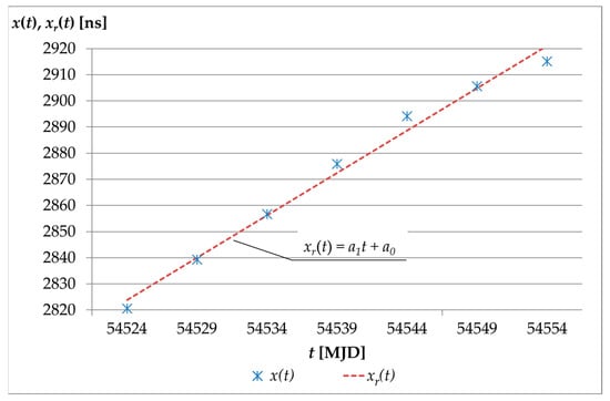 - xa(t)—historical results of phase time measurements between 1 pps (pulse per second) signals from UTC(k) and the clock realizing UTC(k), determined with a one-day interval according to the relationship: