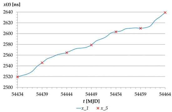 The publication by BIPM of the xbr(t) values every Wednesday enables the first prediction of [UTCr-UTC(PL)] to be determined each week, for the MJD day that ends with digit 4 or 9 with a shorter prediction horizon of three to seven days, compared to the prediction horizon for time series built on the basis of the UTC scale. This makes it possible to introduce another method of constructing time series (Figure 8), the values of which are determined with a one-day interval. The basis for the preparation of these time series are the xb(t) and xbr(t) deviations determined on the basis of the UTC and UTCr scales, respectively.