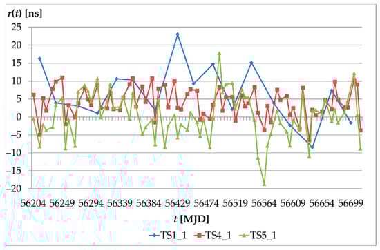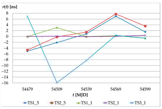 The method of constructing the TS4_1 and TS5_1 series has been assessed on the example of UTC(PL) prediction based on the UTC and UTC Rapid scales by means of the GMDH-type NN. The research has been carried out over a period of 17 months, from MJD 56204 to MJD 56699, determining the first prediction in each week for days that end with digits 4 or 9. Input data for the GMDH-type NN are the TS4_1 and TS5_1 time series. In order to compare the quality of determined predictions for two methods of preparing time series in the same period of time, the TS1_1 has been selected from the first method of the time series preparation. For this time series, it is possible to calculate only one prediction per month. Figure 10 shows the results of the calculations of the residuals (r) for determining the xbp(tpred) predictions for UTC(PL) by the GMDH-type NN for the TS1_1, TS4_1, and TS5_1 time series.