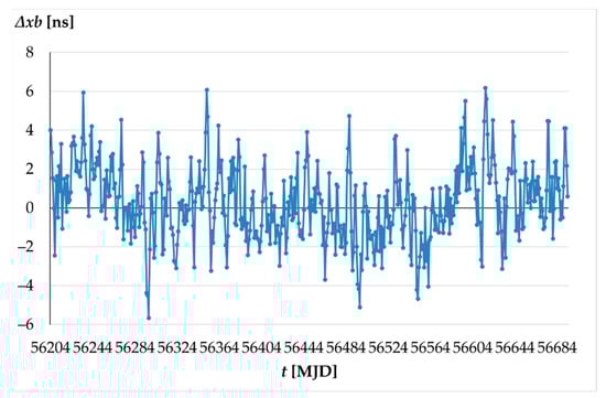 Figure 9 shows an exemplary set of ∆xb values for the period of 491 days (from MJD 56204 to MJD 56694). In the analyzed period of time, there are 99 MJD days that end with the digits 4 and 9, but only for five MJD days (56274, 56499, 56544, 56559, and 56659) does ∆xb = 0. However, for all 491 days, the values ∆xb = 0 are only for 13 days. Figure 9 also shows that the discrepancies between the values of xb and xbr are within the interval of −5.7 ns to 6.2 ns for the entire analyzed period, and for 99 MJD days ending with the digits 4 and 9 in the interval of −3.7 ns to 4.0 ns.