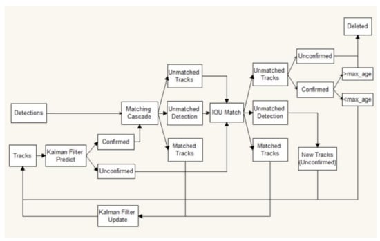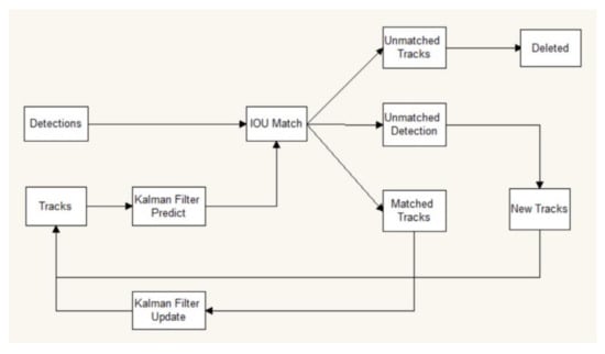 DeepSORT was developed from SORT. Information about the exterior of the objects was added in order to match objects in adjacent frames. The procedure of DeepSORT is as follows: first, the Kalman filter is used to predict the trajectory. Then, the Hungarian algorithm is used to match the predicted trajectory with the detections in the current frame (cascade matching and IOU matching). Thereafter, the Kalman filter is updated. DeepSORT can be applied in Multiple Object Tracking (MOT), which can assign each vehicle with different IDs. The object tracking procedure of DeepSORT is shown in Figure 2.