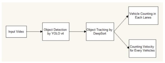 The complete process is shown as a flow chart in Figure 3. After inputting the video, our system detects the vehicles using YOLO v4, and then tracks the vehicles using DeepSORT. Finally, the number of vehicles that passed through each lane and the velocity of each vehicle are calculated.