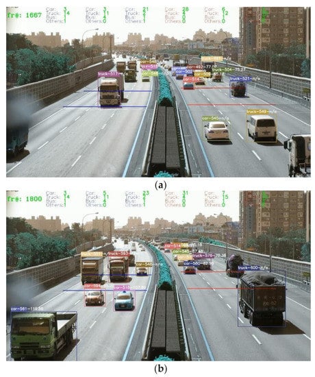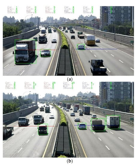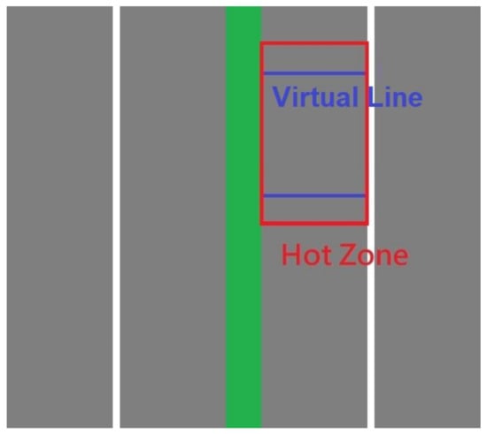 In recent years, deep learning techniques for optimizing object detection and tracking have developed rapidly and have been applied to human and vehicle traffic flows [,]. To our knowledge, this study was the first to introduce virtual lines and hot zones to a deep learning object detection and tracking system for lane-specific vehicle counting and velocity estimation.