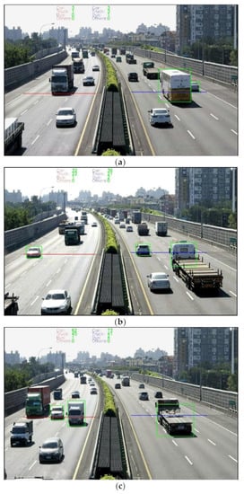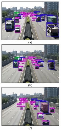 Object detection results on the video taken on National Freeway No.1 (a–c). The identified vehicles were wrapped with their respective bounding boxes. The colors of the bounding boxes represent the categories of the vehicles: cars (magenta), trucks (blue), and buses (green).