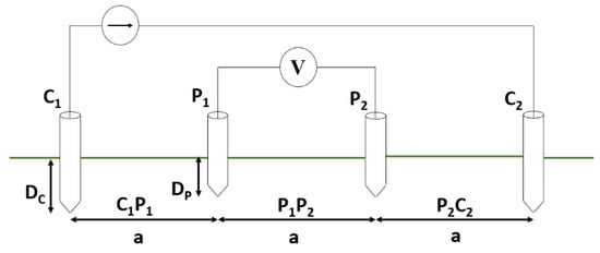 Measurements were successfully achieved using the Wenner method, which is the most widely used and easy method for measuring soil resistivity in an earthing system. The Wenner method is the simplest arrangement with four poles, denoted as C1, P1, P2 and C2, and a set of reading probes spaced during testing [33,34,35,36]. All electrodes are placed in one line and equally spaced from each other. The two outer electrodes, namely C1 and C2, are current electrodes and the two inner electrodes, P1 and P2, are potential electrodes. Figure 3 presents a schematic of the Wenner measurement method currently used by the power utility for on-site SR measurements.