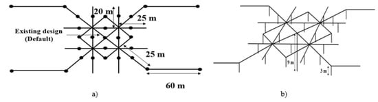 Lastly, Figure 6 illustrates the Design C, known as the diamond, with 4 × 60 m counterpoises installed additionally to the vertical electrodes. For this particular design, there were 28 vertically driven electrodes installed at a depth of 3 m, on top of a 9 m electrode that was initially installed based on the default design.