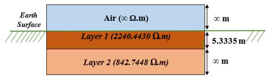 In the quest to interpret the soil profiles, we inferred from the results that the soil profiles for each tower consisted of two, three and sometimes four layers with different values of soil resistivity. As indicated in Figure 8, the Tower T42 soil profile had two layers. The surface layer, referred to as air, had infinite resistivity and thickness. The first layer of the soil had a resistivity of 2240.443 Ω⋅m and a thickness of approximately 5.3335 m, while in case of the second layer, it was 842.7448 Ω⋅m and an infinite thickness.