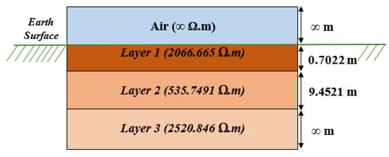 Figure 9 shows the soil structure for Tower T48, which was composed of three layers with different soil resistivity. Results indicated that the highest soil resistivity was recorded at the third layer with 2520.846 Ω⋅m and an infinite thickness. The first and second layer showed 2066.665 Ω⋅m and 535.7491 Ω⋅m and the thickness of 0.7022 m and 9.4521 m, respectively.