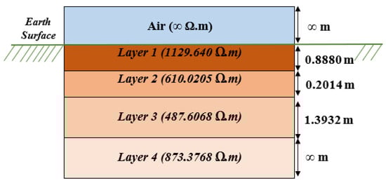 Figure 10 presents the four-layer soil profile for the Tower T50. Result indicated that the soil resistivity of the first layer was 1129.640 Ω⋅m and its thickness was 0.8880 m. The second and third layer showed the values of soil resistivity of 610.0205 Ω⋅m and 487.6068 Ω⋅m, having the thicknesses of 0.2014 m and 1.3932 m, respectively. The fourth layer, denoted as the bottom layer, had a resistivity of 873.3768 Ω⋅m and an infinite thickness.