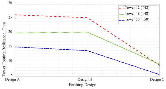 In this section, the tower footing resistance computation is presented for three different design arrangements: (i) default design with counterpoise (Design A) (ii) radial and ring electrodes (Design B) and (iii) diamond with counterpoise and electrodes (Design C). Specifically, the TFRs were computed for three conditions of soil structure, as described in Section 3.1. Figure 11 presents the TFRs for the three types of earthing design buried in a two-layer (T42), three-layer (T48) and four-layer (T50) stratified soil. Results indicated that the Tower T42 had the highest TFR value as compared with Tower T48 and Tower T50. In this case, the resistance was influenced by the first layer, which had a high soil resistivity. This particular layer had a soft topsoil, porous enough to retain ample air and water. In comparison, the middle and bottom layers were harder and more compact than the top layer. These layers did not contain any organic matter and consisted of a rock that made them very rough [45]. Changing Design A for Design C reduced the TFR of each tower by more than 50% (66% for T42, 54.7% for T48 and 63.2% for T50). Table 5 summarizes the TFR values improvements when Design B or Design C were deployed to each of the towers.